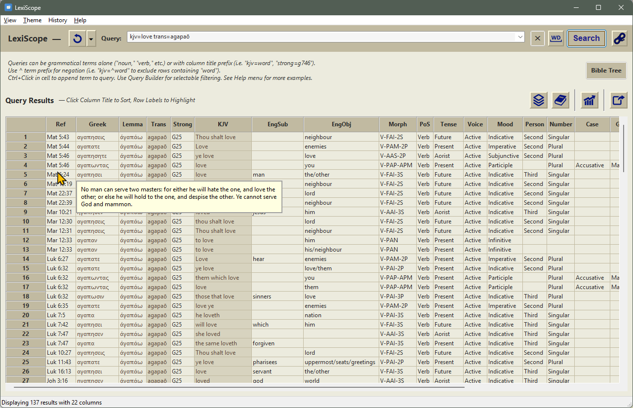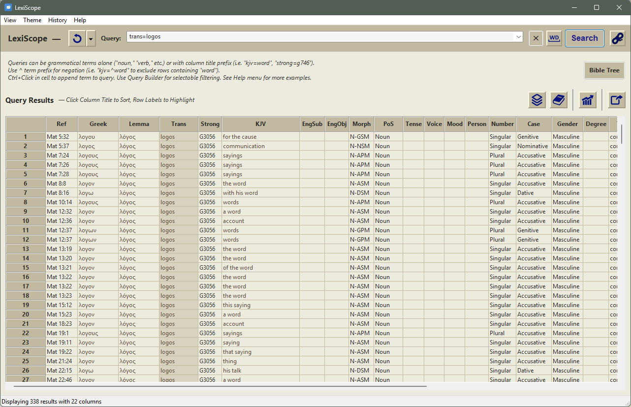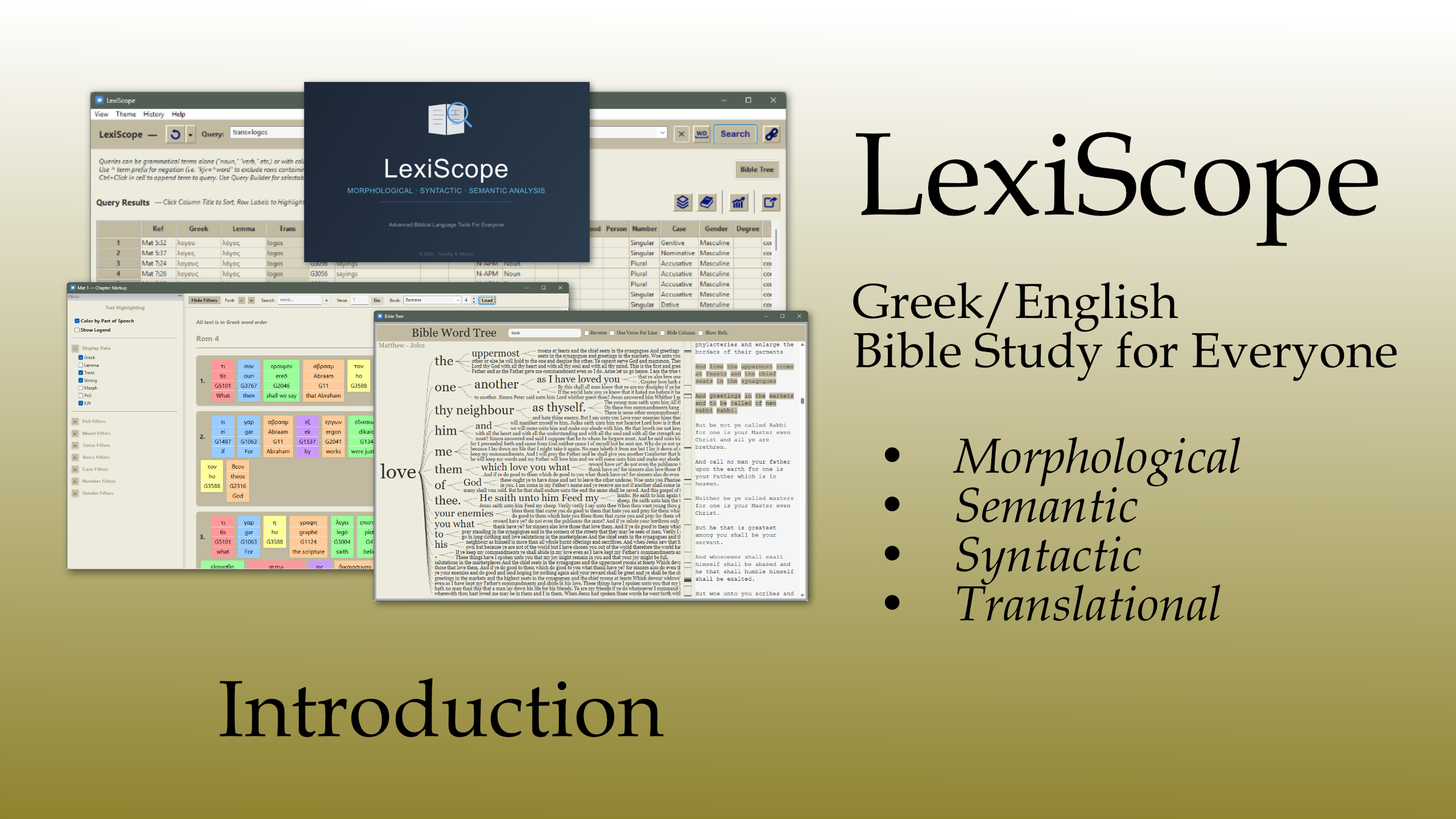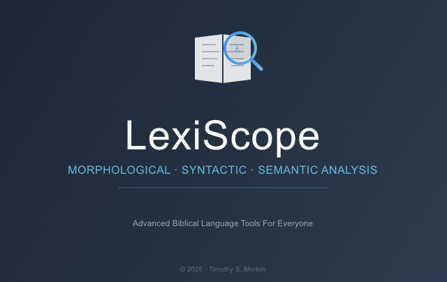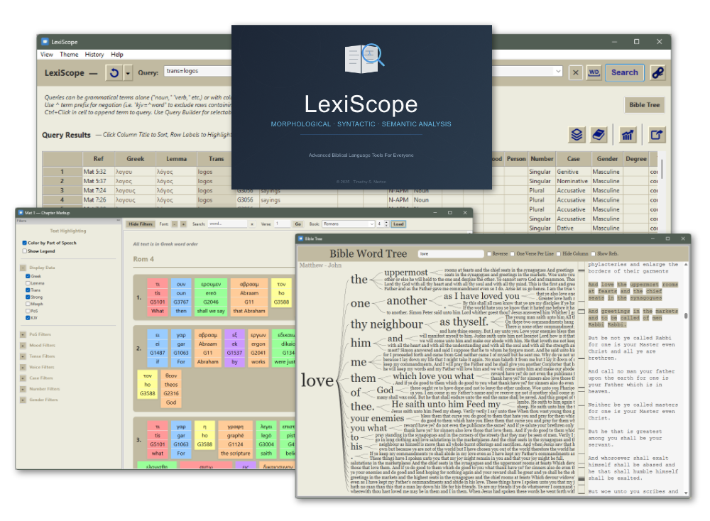 LexiScope is a a comprehensive digital tool for biblical language research, enabling any Bible student to perform sophisticated morphological, syntactic, and semantic analysis of New Testament Greek and KJV English texts through an intuitive, natural language interface. Furthermore, LexiScope combines these powerful search capabilities with rich analytical visualizations.