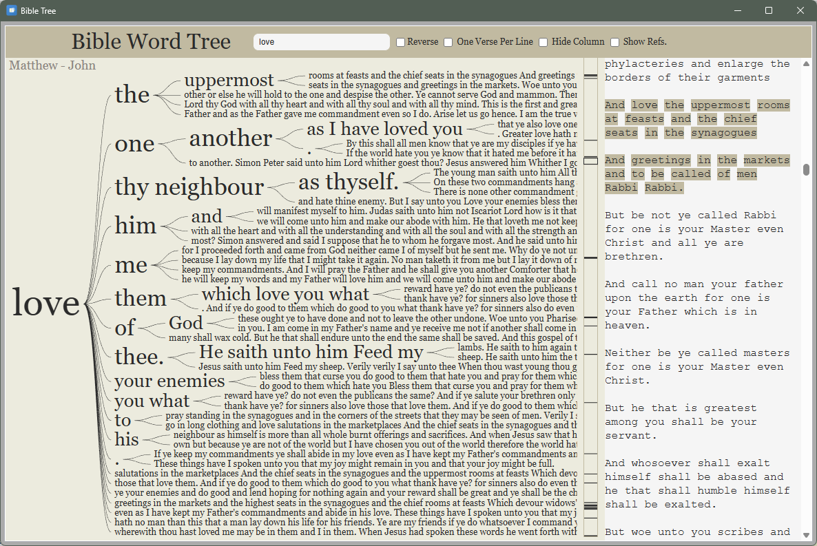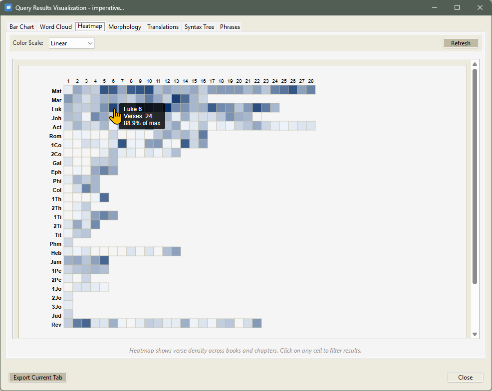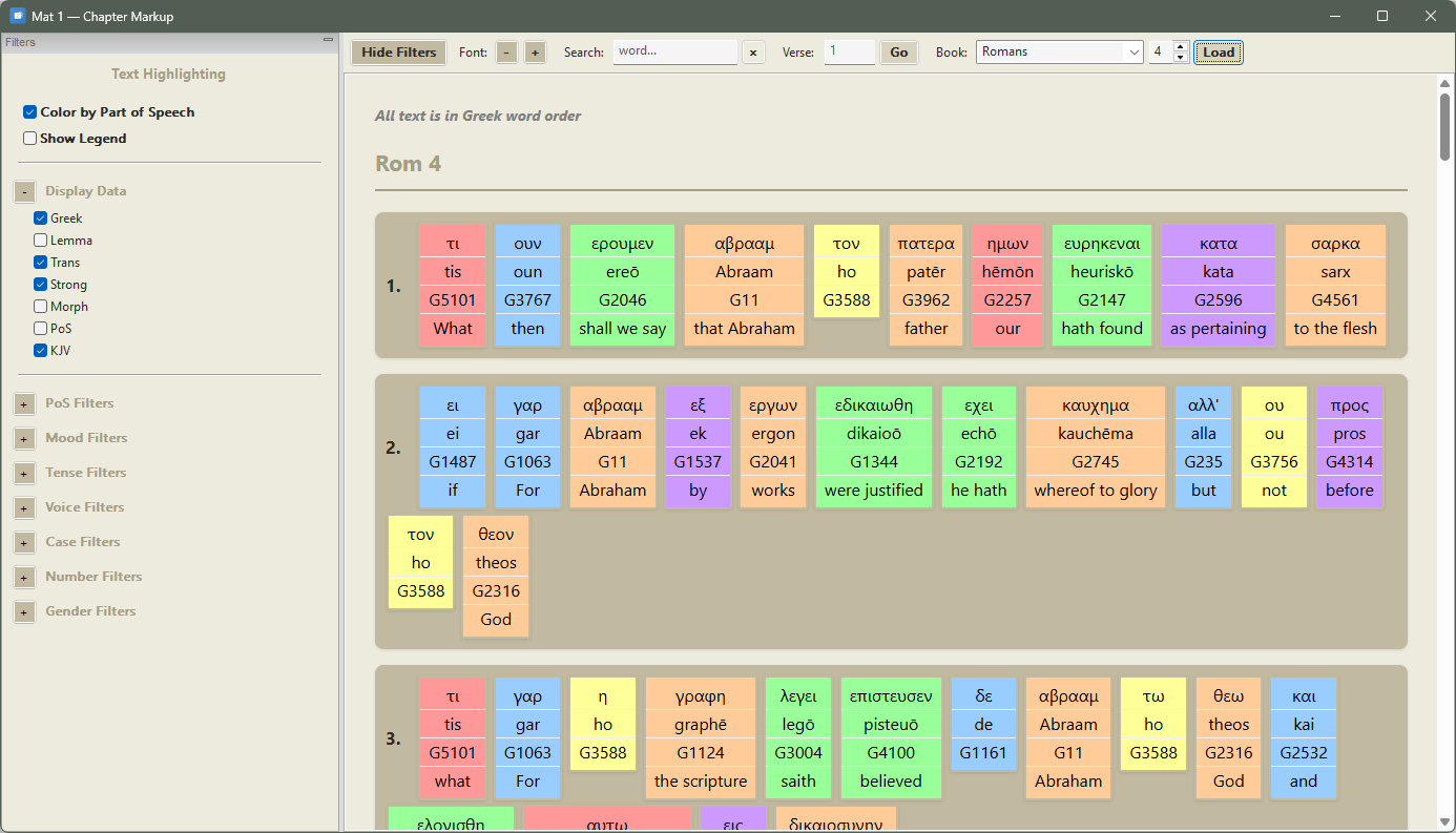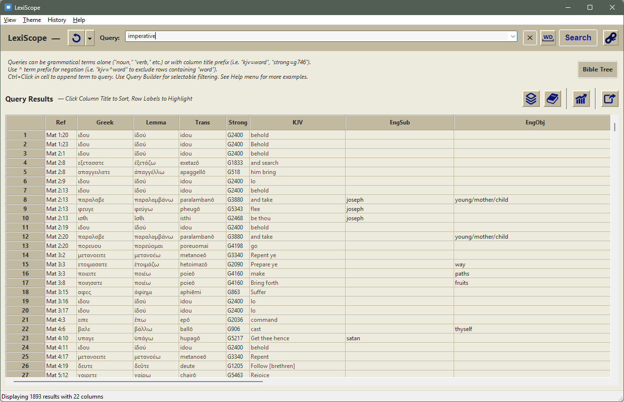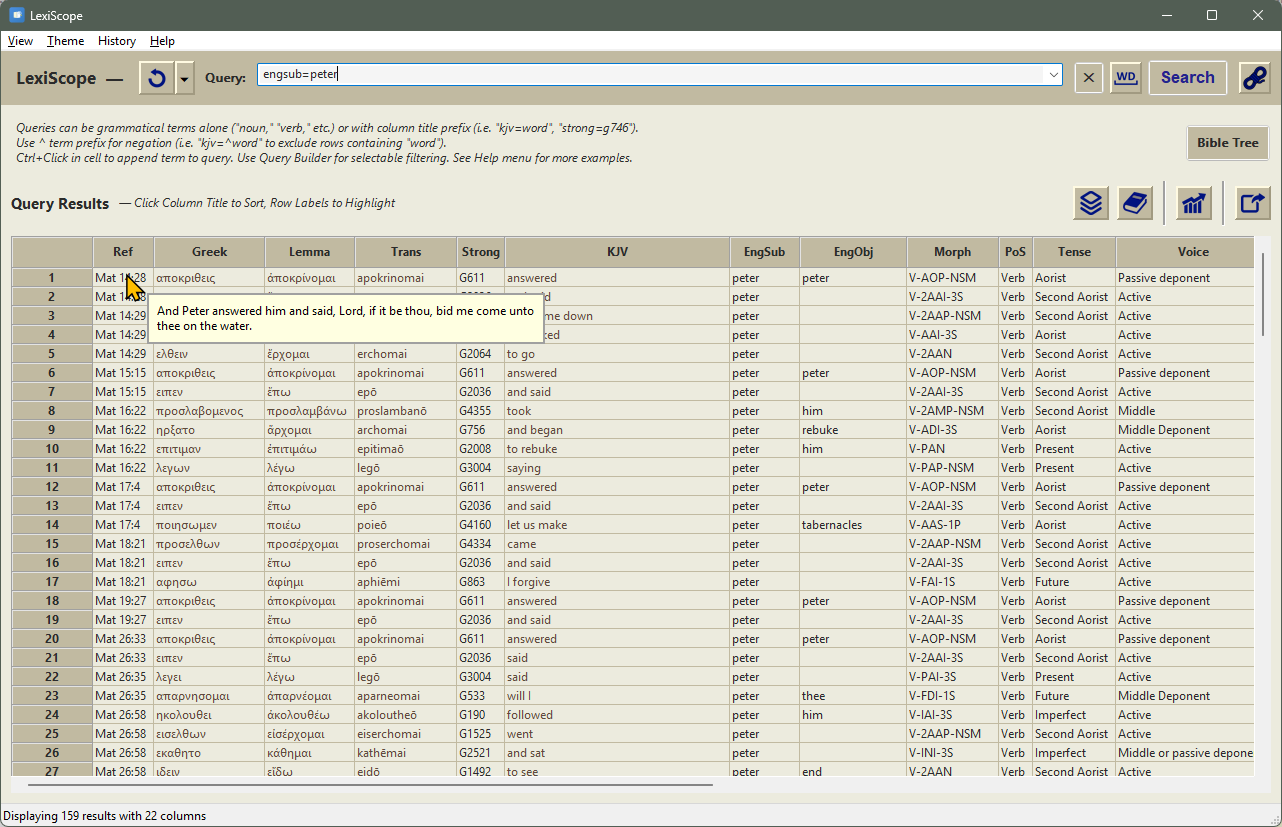 LexiScope is a a comprehensive digital tool for biblical language research, enabling any Bible student to perform sophisticated morphological, syntactic, and semantic analysis of New Testament Greek and KJV English texts through an intuitive, natural language interface. Furthermore, LexiScope combines these powerful search capabilities with rich analytical visualizations.